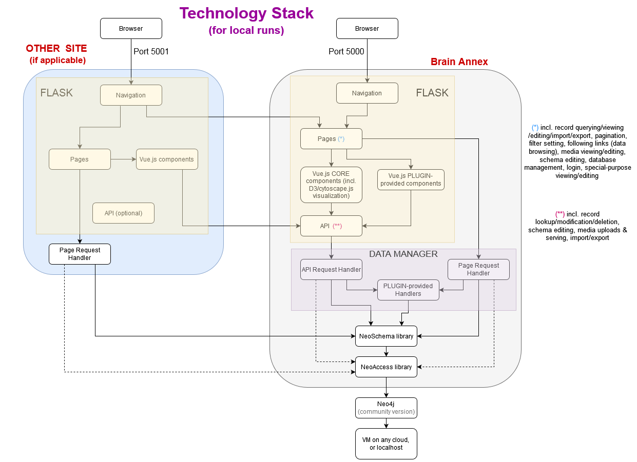INFRASTRUCTURE: * Eliminated unnecessary multiple connections to Neo4j. Introduced a shared initialization module * Flask routing modules made more readable and modular by making use of Python Classes * Improved modularity of site-pages data (for site navigation) * Simplified and streamlined integration of Brain Annex into host sites * Cleanup and centralization of configurable parameters * Simplification to records editing LIBRARIES: * Expansion of NeoSchema and Categories API: * Several new API endpoints, primarily schema-related, and for supporting editing of relationships (links) among data nodes (data records) NEW FEATURES: * Early partial implementation of link editing in records BUGFIXES: * Restored functionality to the "Cancel" operation in record editing |